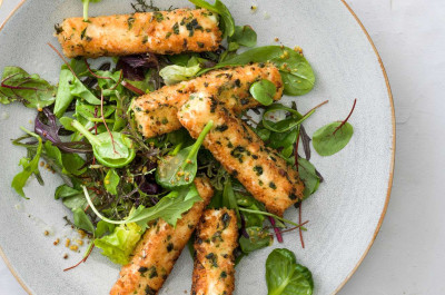 Croustillants et panés avec du panko mélangé à de l’ail des ours, les bâtonnets de feta apportent une savoureuse touche d’originalité à la salade verte.